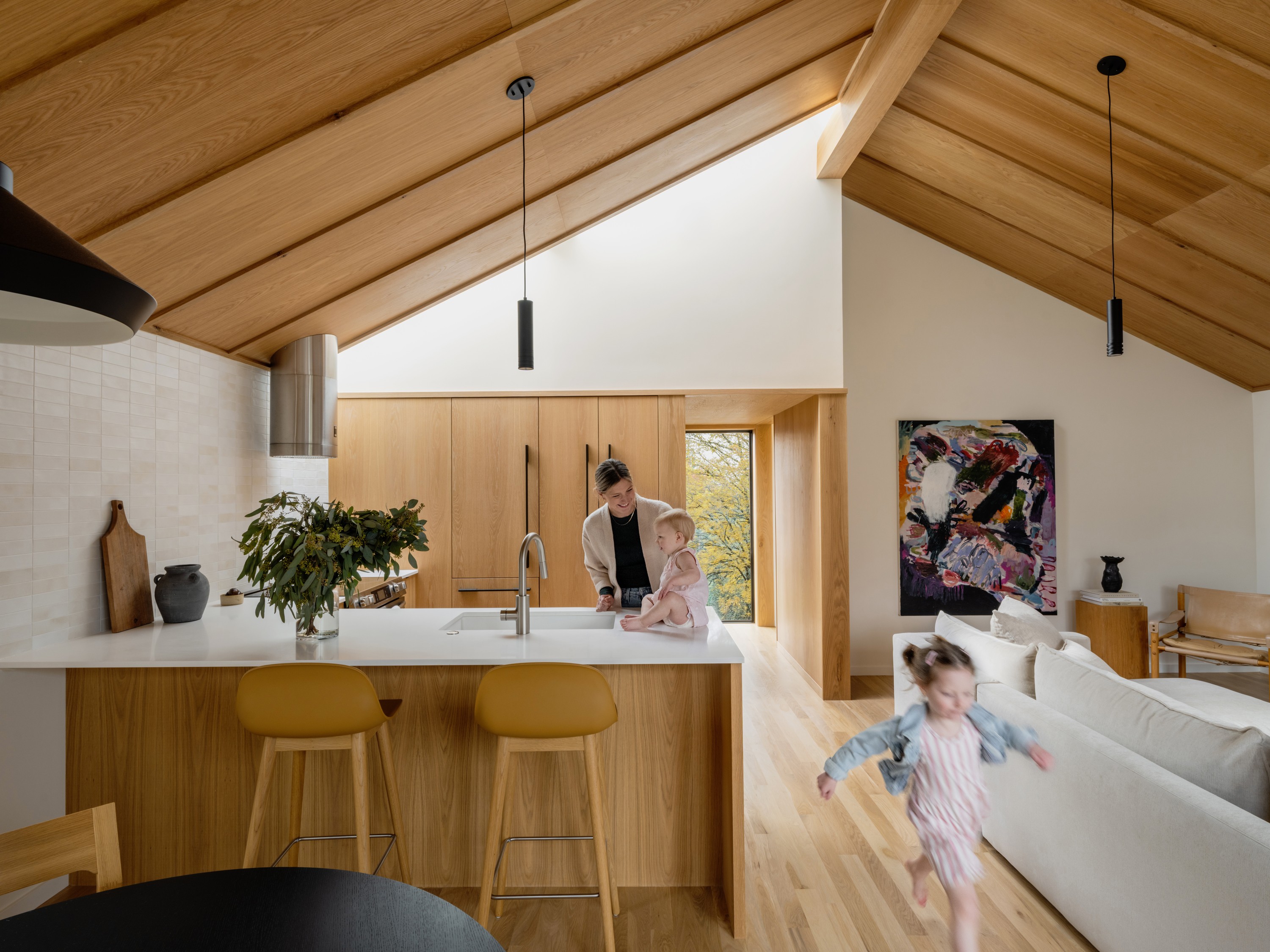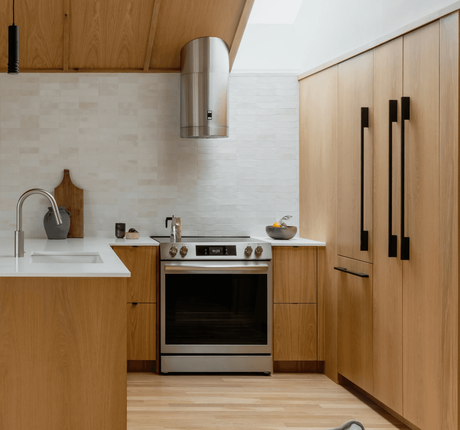 Working alongside TaylorSmith SC, we built the cabinetry for a southeast Portland ADU kitchen that blends seamlessly into the paneling throughout the home.