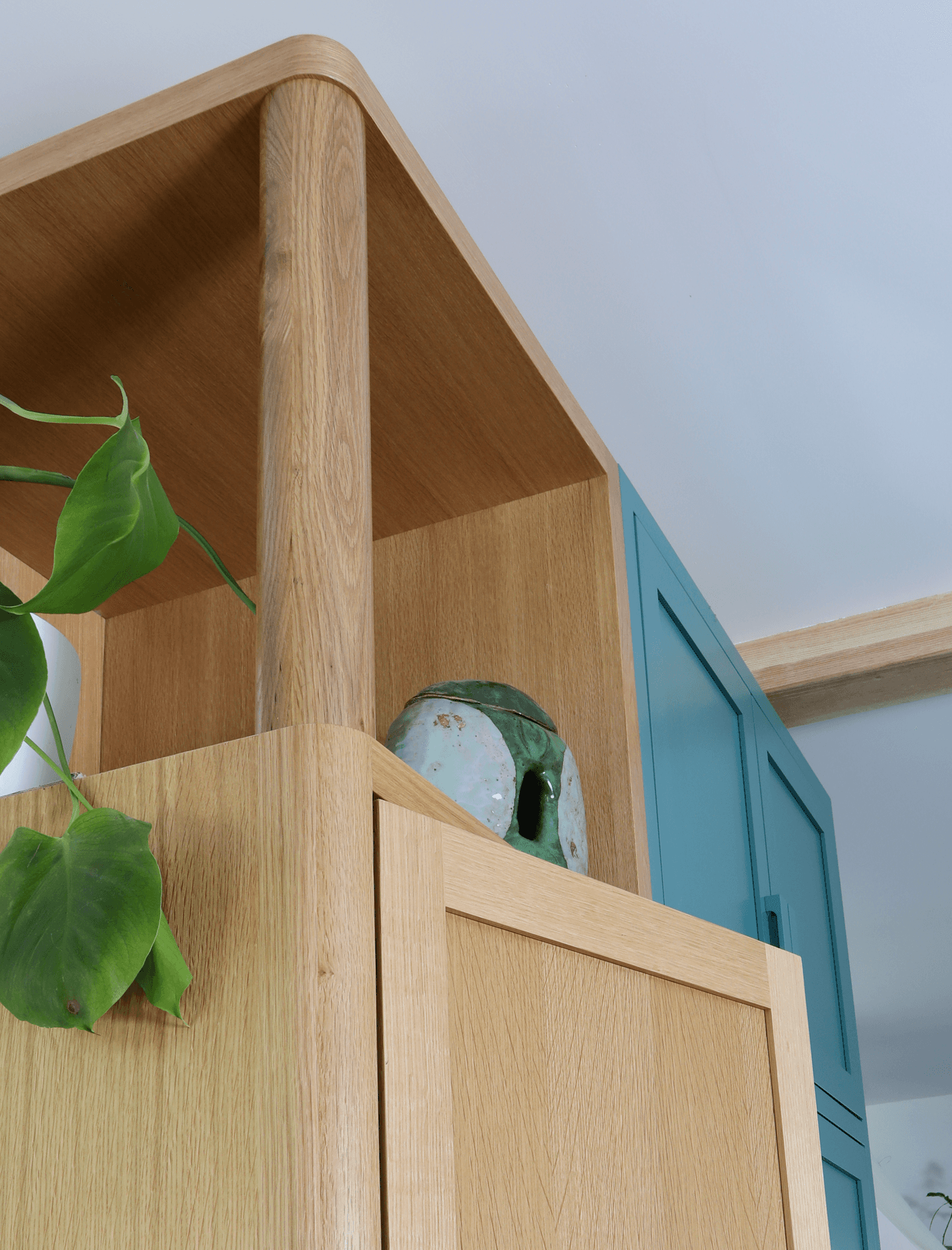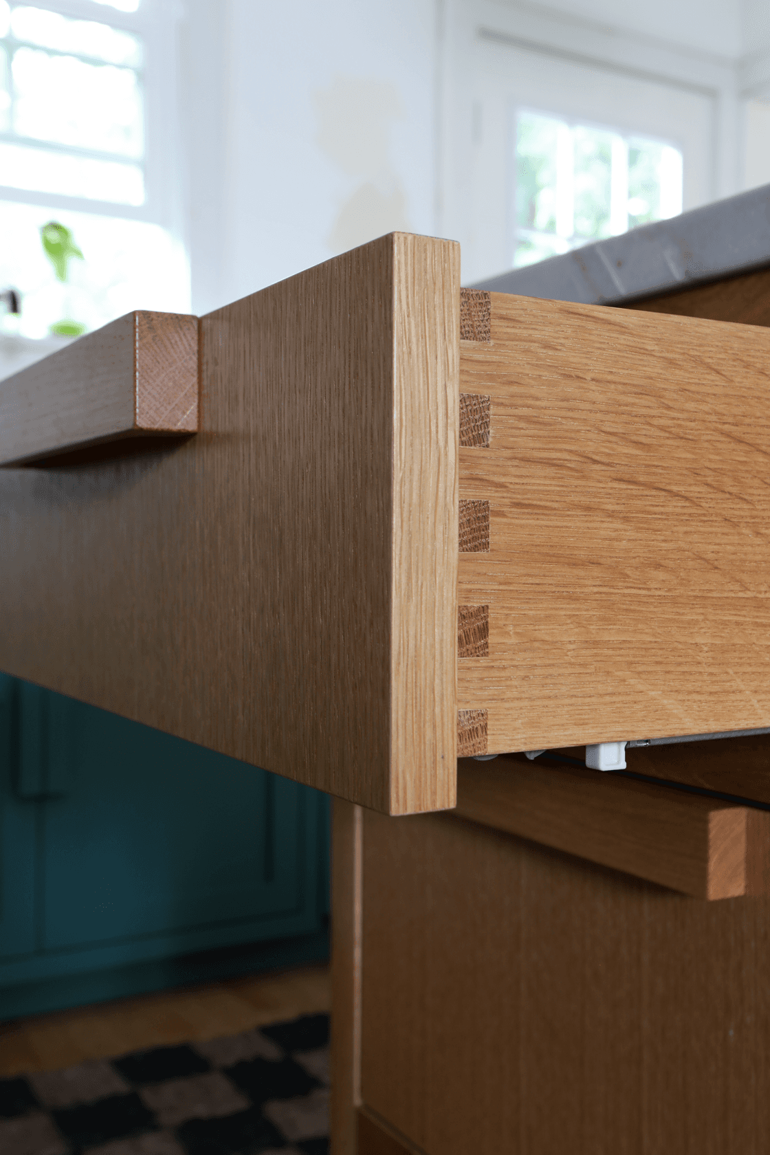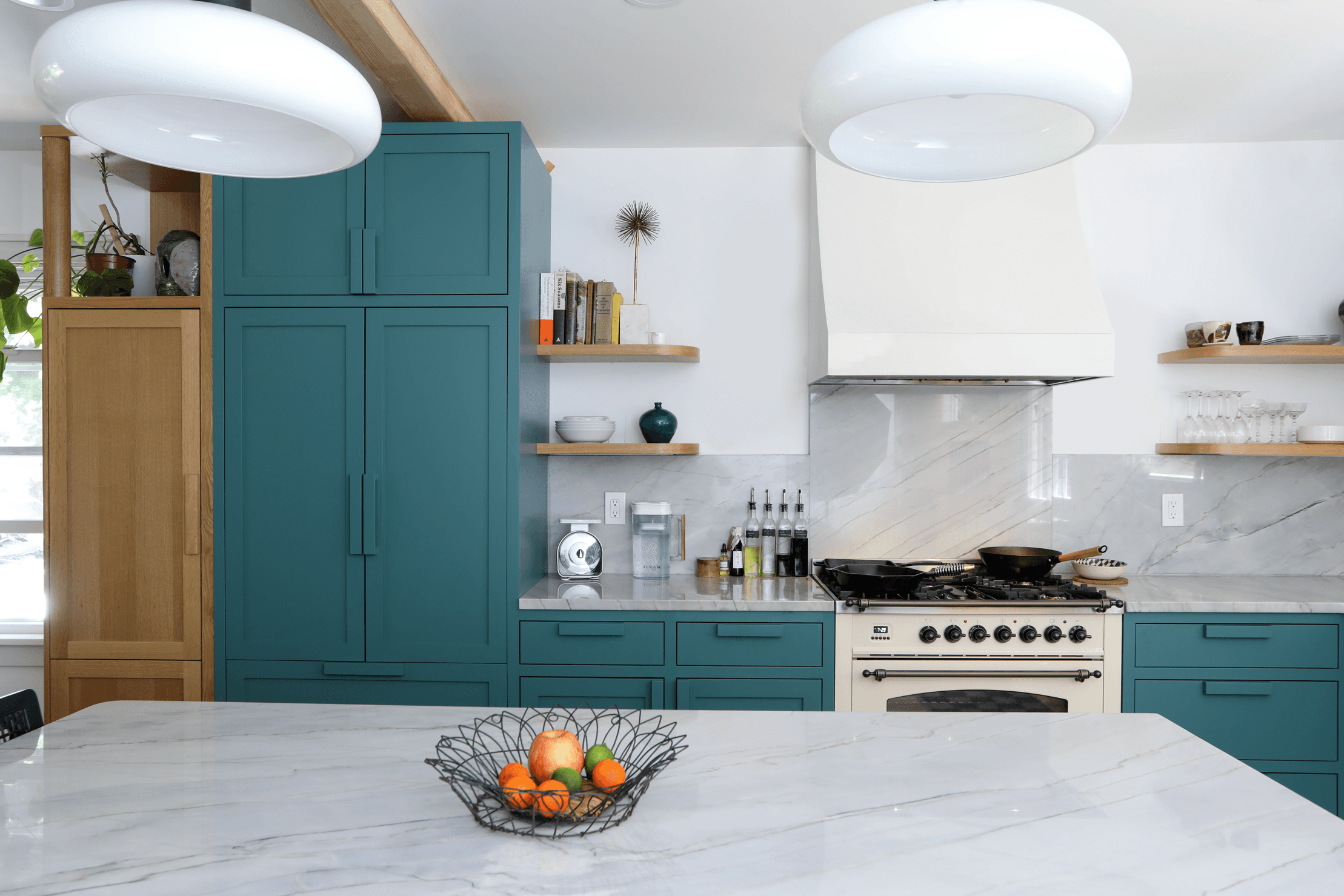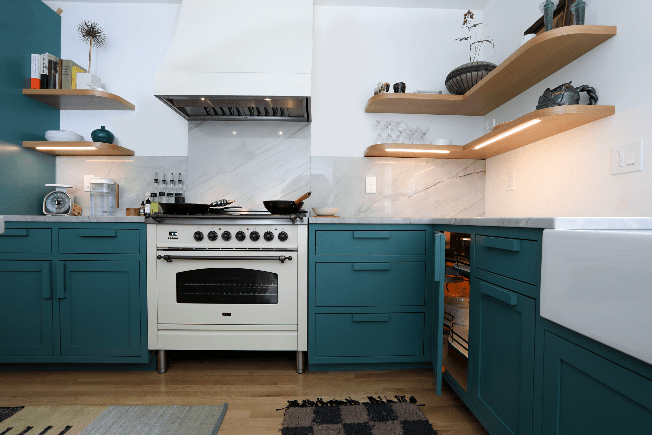 For our client's kitchen, we mixed exposed wood and lacquer finishes to create a palette with contrast and cohesion. Rounded corners and chunky handles create a space that's friendly and inviting, while details like finger joints and panelized appliances emphasize high level of craft and quality.