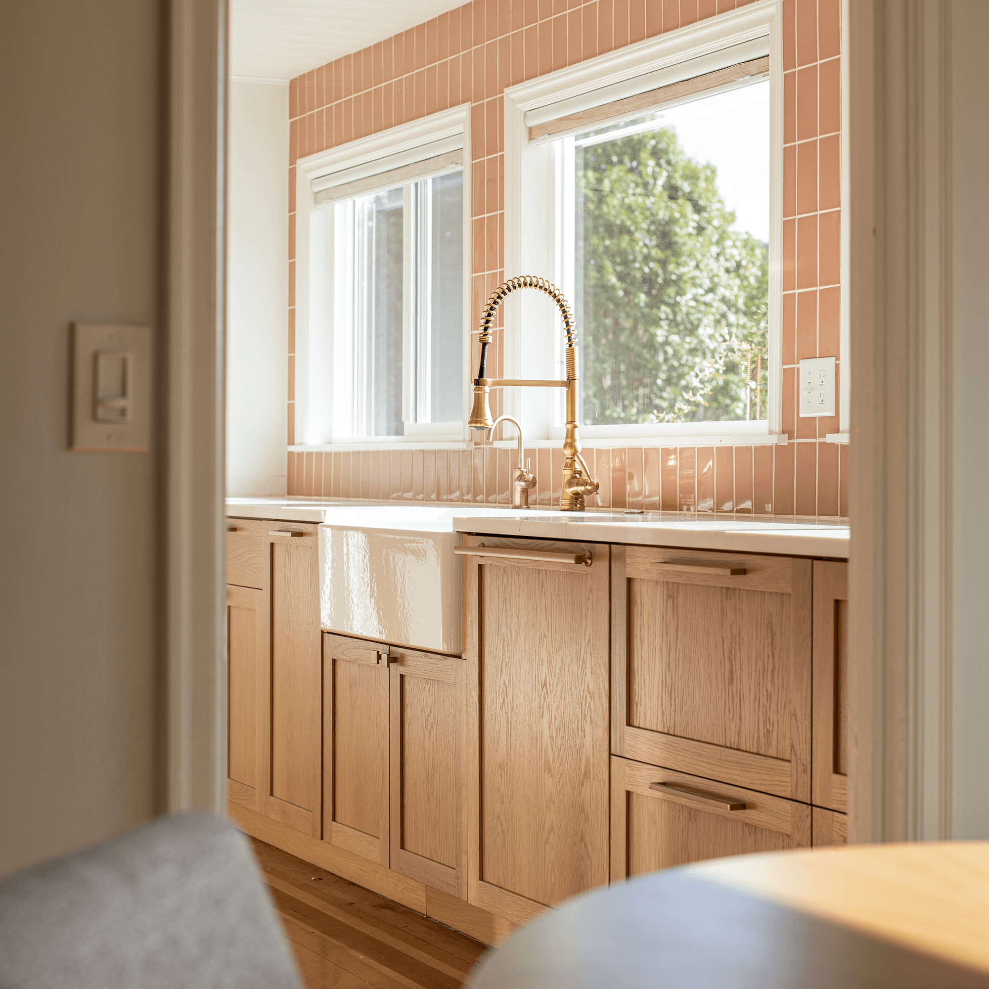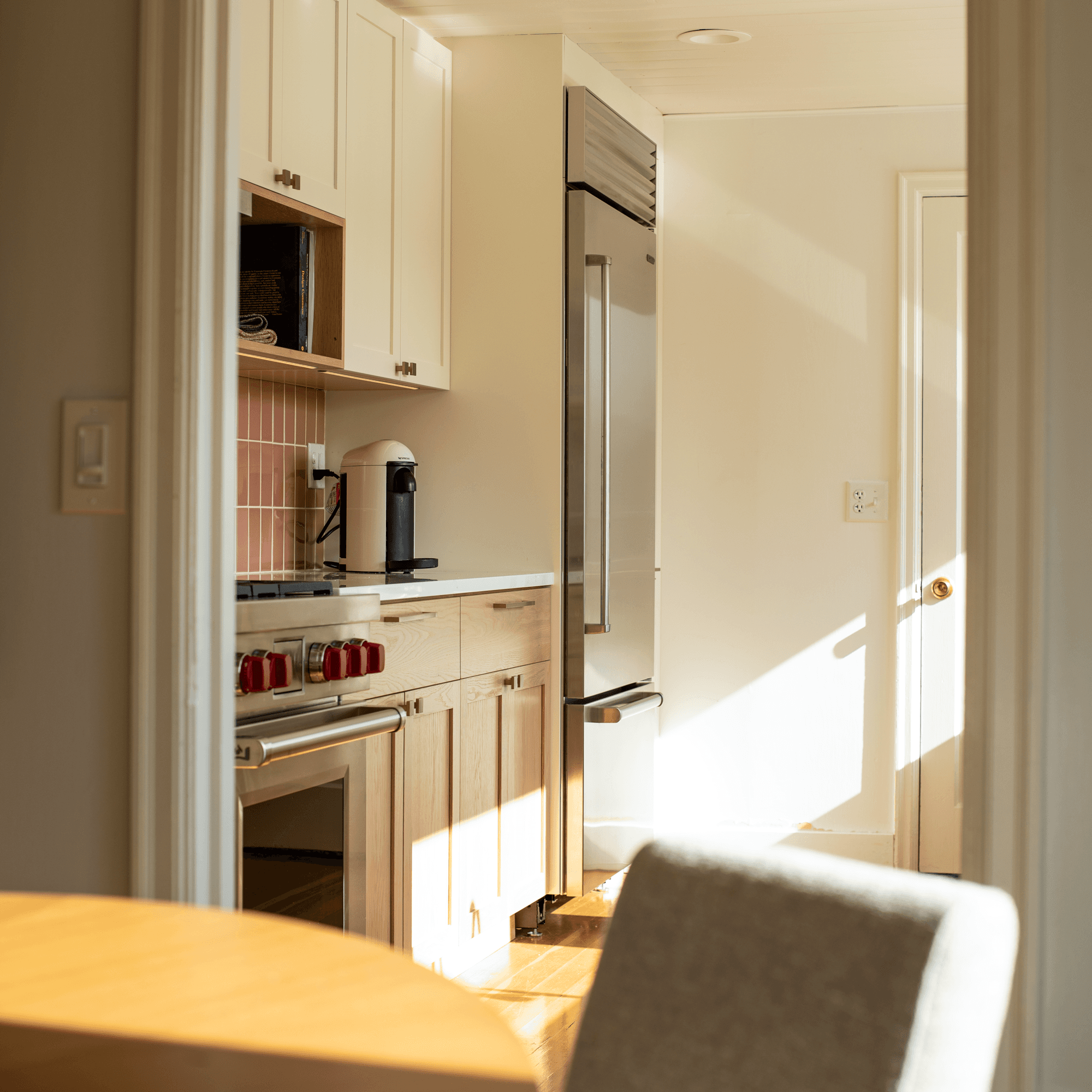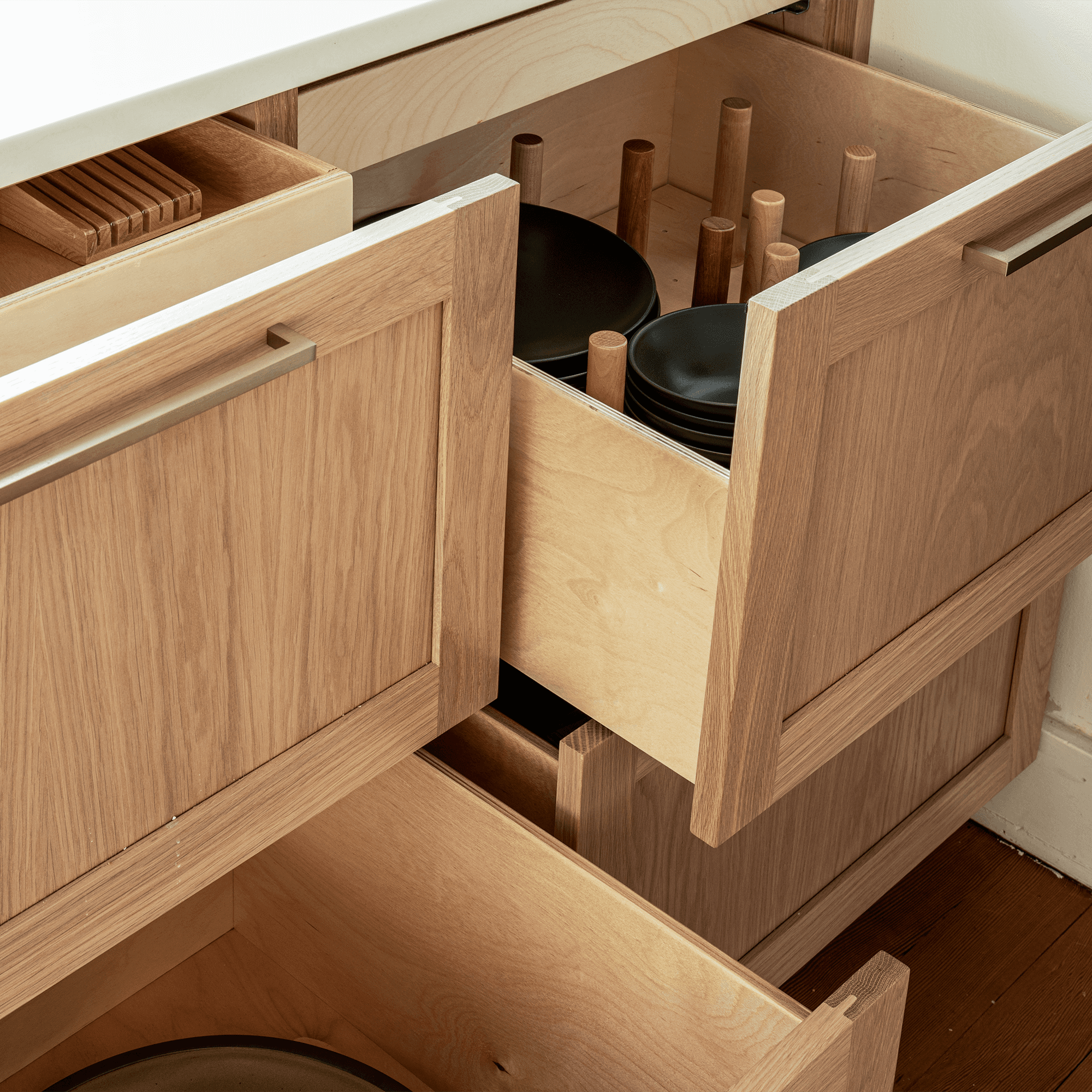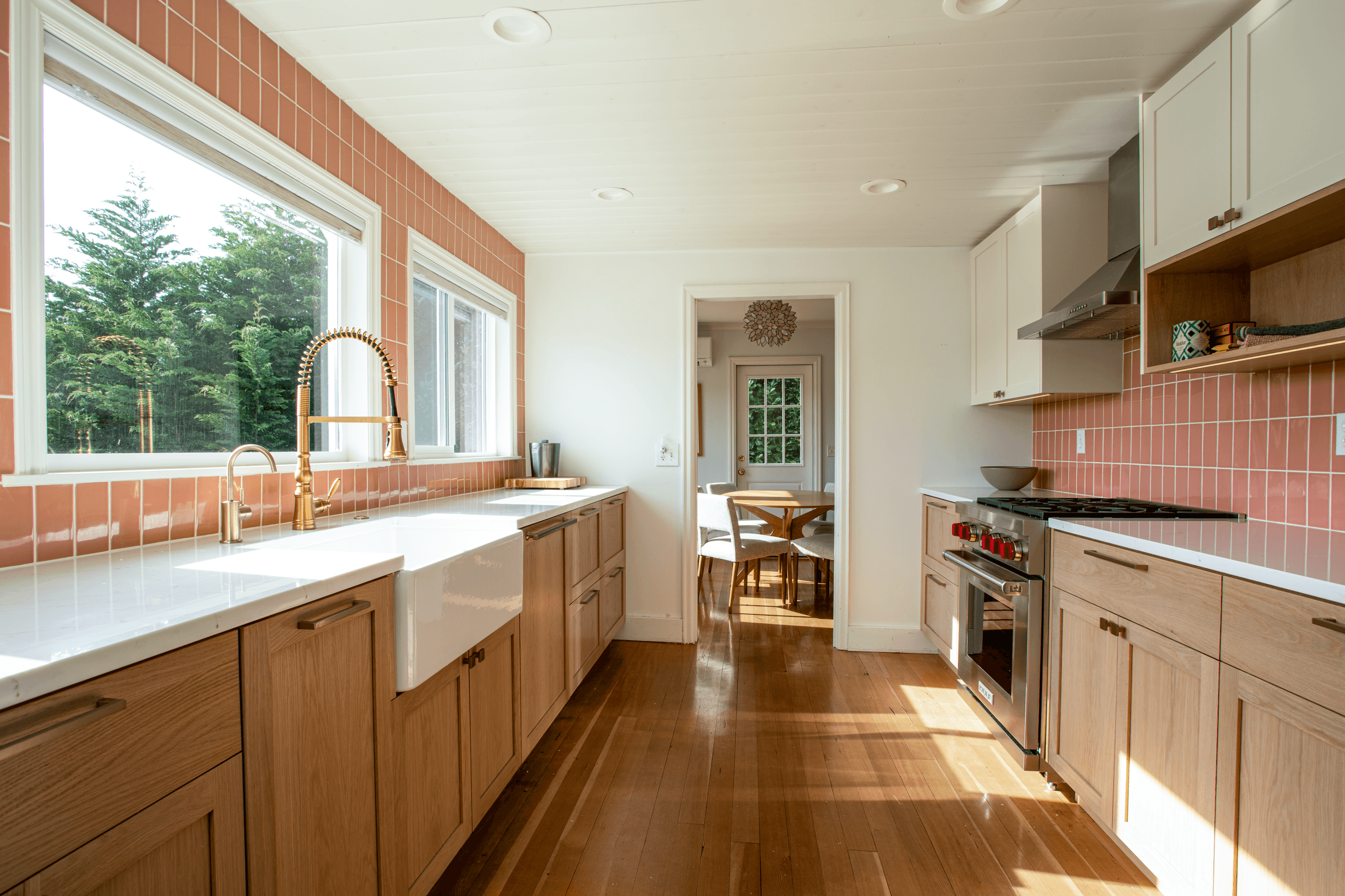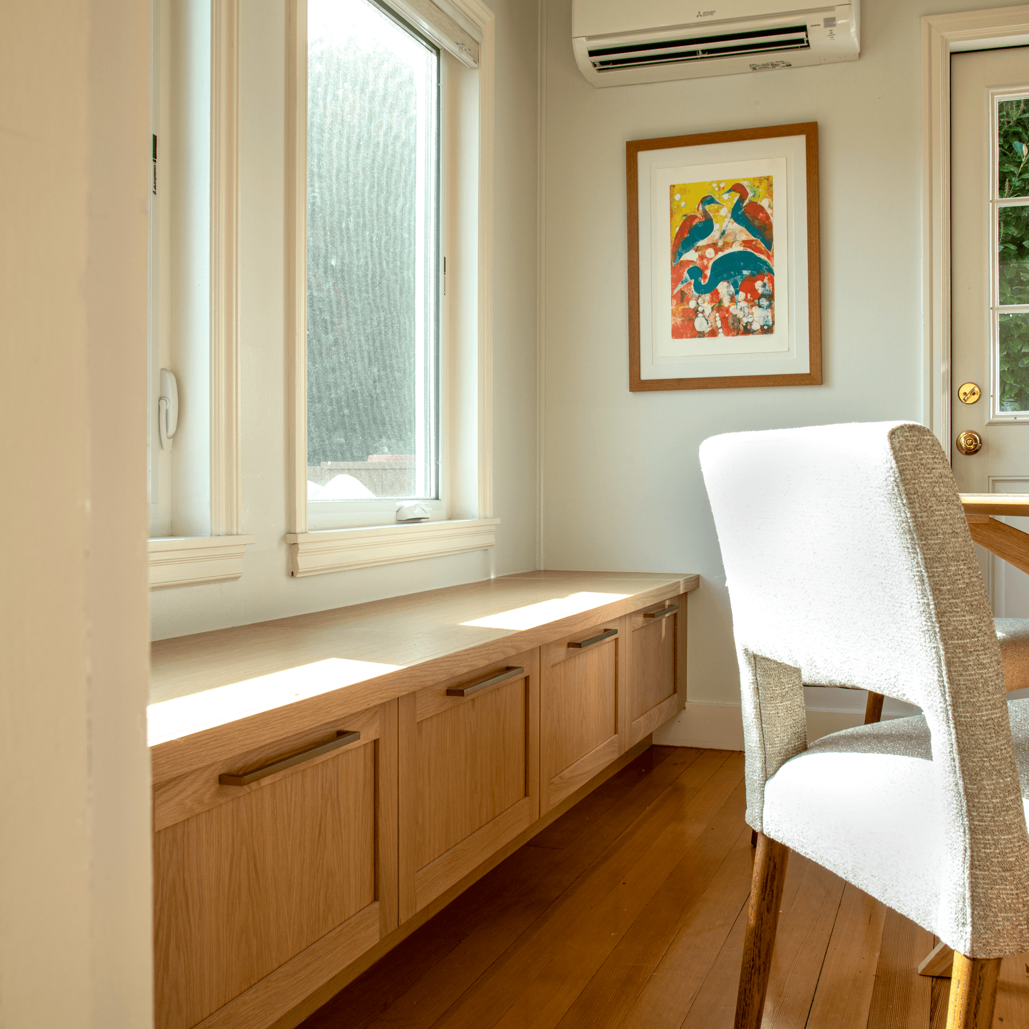 We took a trip down to Reedsport, Oregon to install this sun-soaked kitchen and complimentary dining bench. Generous use of nested drawers and hidden storage was used to maximize functionality without creating visual clutter.